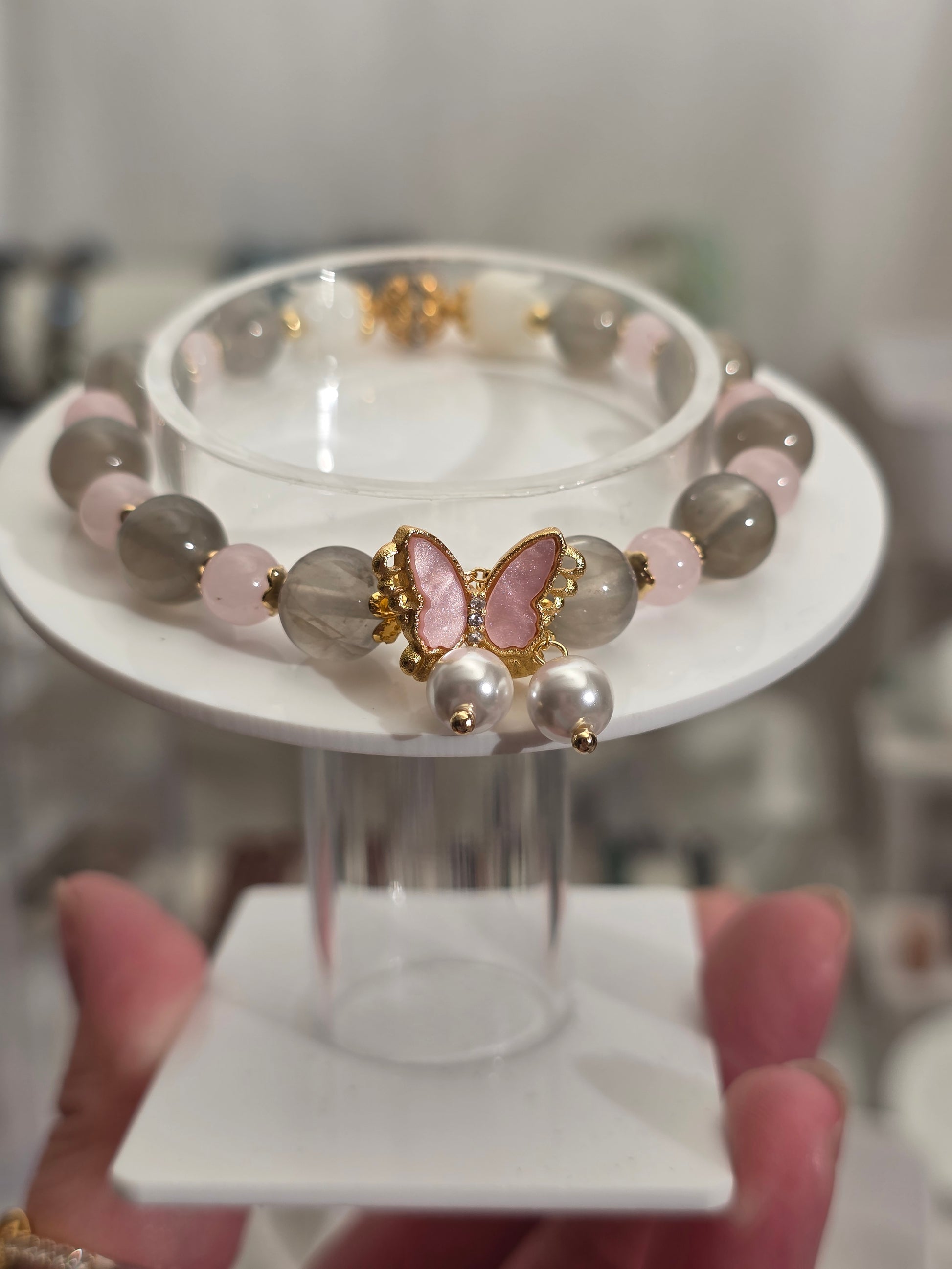 Black Moonstone and Rose Quartz with Butterfly Charm Bracelet