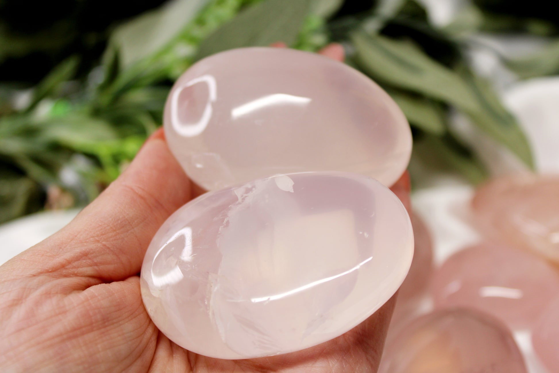 Girasol, also known as Milky Quartz, has a softer energy than Clear Quartz. These Girasol Rose Quartz Palms filters out negative emotions such as depression, anxiety, fear, and anger. It strengthens your love, compassion, and courage for all things you love.