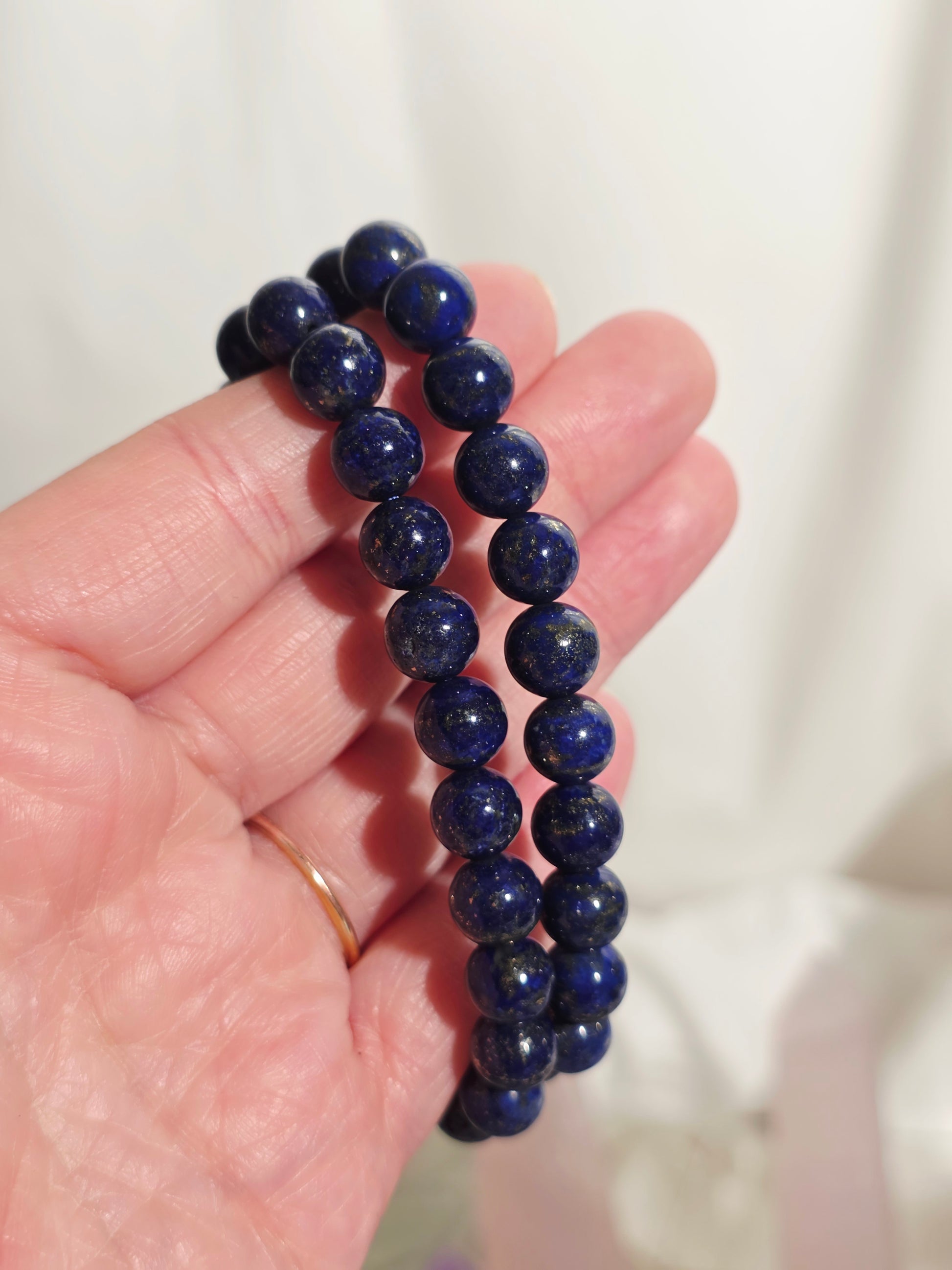 This handmade bracelet features rich lapis lazuli beads, a stone revered for centuries as a symbol of wisdom, truth, and spiritual insight. Known for its deep, celestial blue hue, lapis lazuli is believed to enhance intellectual ability, stimulate clarity of thought, and strengthen intuition.
